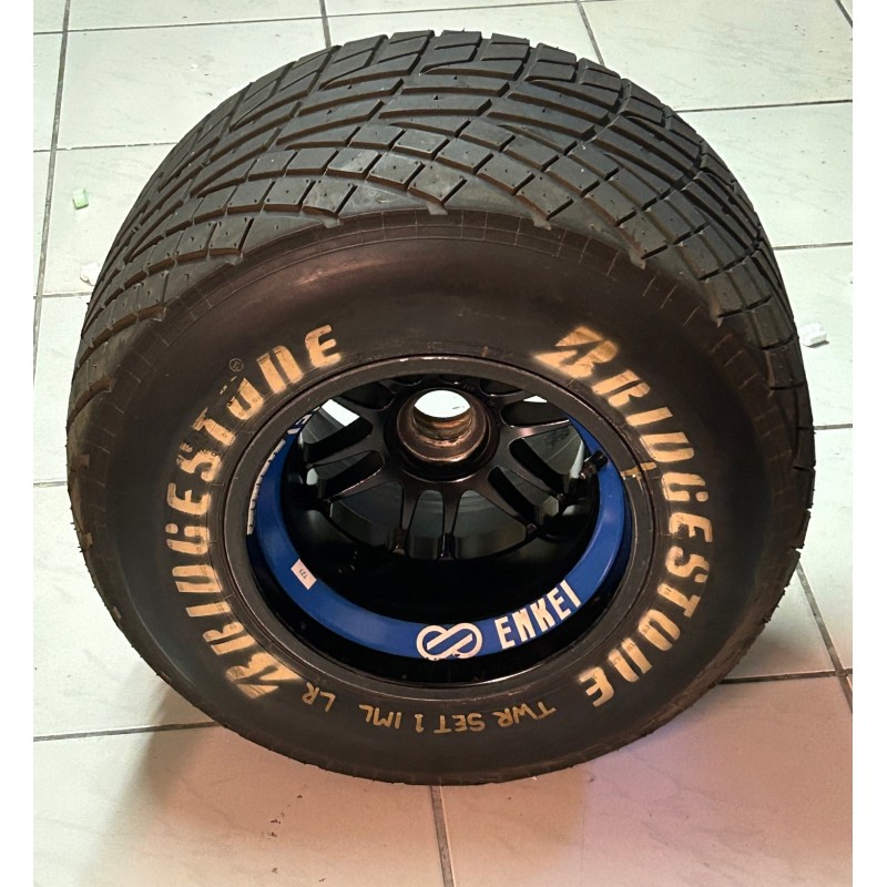 TWR Arrows FA17 complete rear wheel. In 1996, Bridgestone conducted tire tests using a TWR Arrows FA17 to prepare for their 1997 F1 entry. This rare wheel, used in Imola tests, showed that Bridgestone's wet weather technology was particularly advanced. 1996 World Champion Damon Hill tested the tires, reporting good grip and high-level performance. Jos Verstappen and Aguri Suzuki also participated