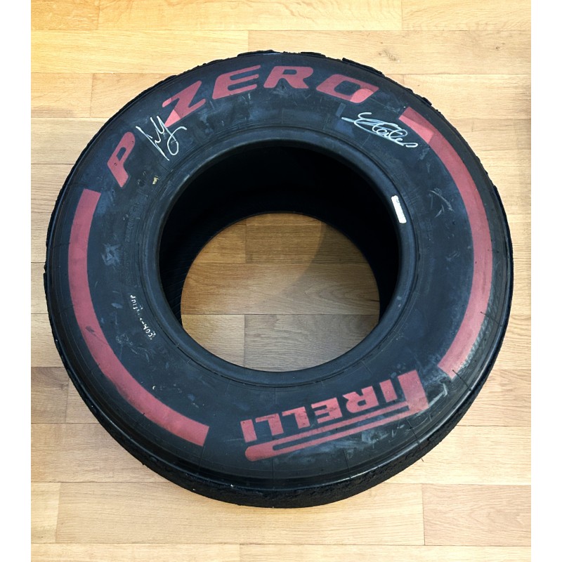 Charles LECLERC and Carlos SAINZ handsigned PIRELLI f1 front tyre, used and signed during 2024 Tests at the Fiorano-Ferrari circuit. PIRELLI soft compound. PIRELLI race-tyres are extremely rare as they are all destroyed by Pirelli after use !!!